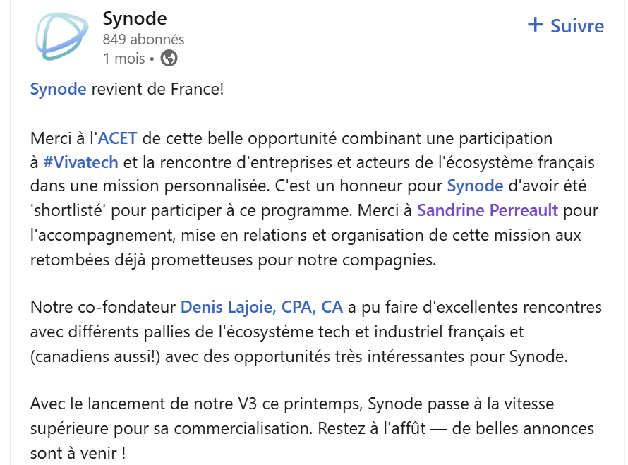 Dans le cadre d’un projet pilote avec deux startups que nous accompagnons, nous avons confié à Sandrine l’orchestration d’une mission commerciale sur mesure en Auvergne-Rhône-Alpes. Conçue pour répondre à leurs besoins spécifiques, cette mission visait à mieux comprendre les attentes du marché, valider l’adéquation de leur solution digitale et de leur proposition de valeur, échanger avec des dirigeants expérimentés et mesurer le potentiel réel de leur solution en France.
